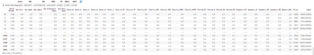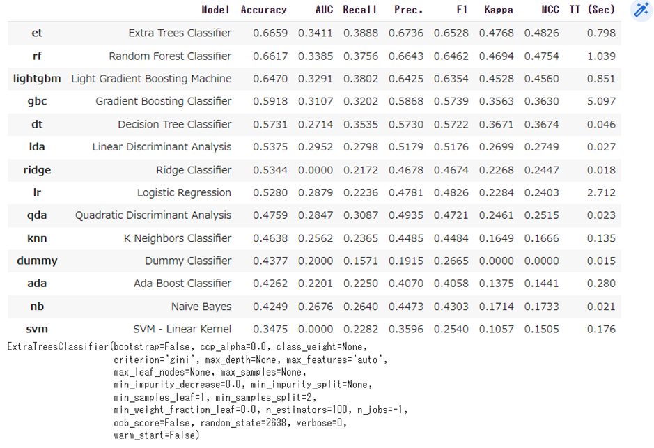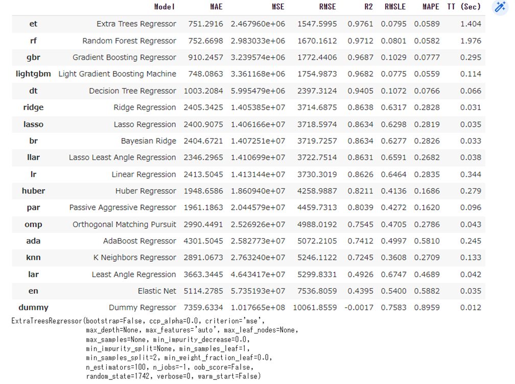 R2(決定係数)が高い順に並んでいます。一番良いのは「et : Extra Trees Regressor」になります。