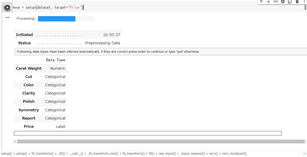 各説明変数のデータタイプが表示されますので、問題なければ「Enter」を押しましょう。